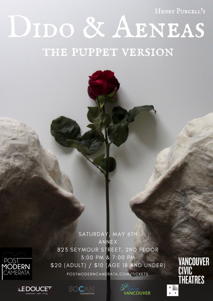 While the six instrumentalists (five strings plus harpsichord) and six voices from the Postmodern Camerata, led by guest musical director Dr Charles Barber (Artistic Director of City Opera Vancouver), present the music in all its baroque splendour, three puppeteers and thirty puppets (the latter ranging in size from six inches to six feet) bring to life the characters in this timeless tale of love gone wrong: a queen desperate for a new chance at joy, a hero washed up on a foreign shore but under direction of the Gods, a sorceress and two evil witches, some very fickle sailors, and a blooded wild beast …