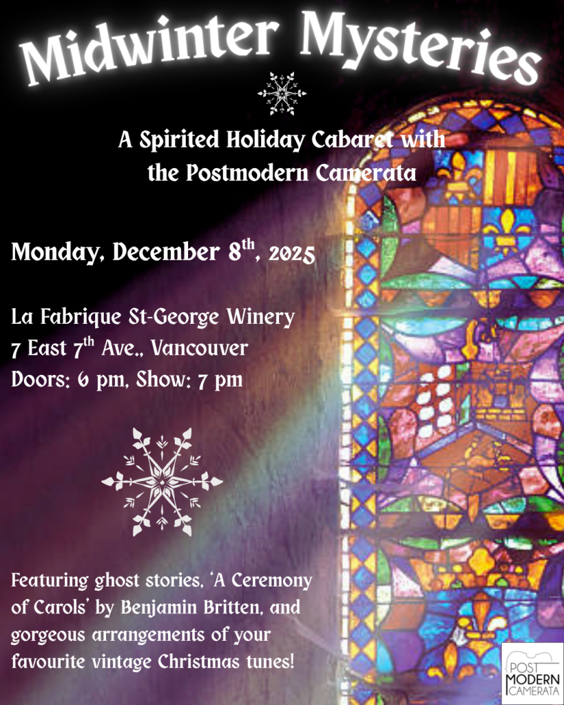 Mezzo-soprano Kim Steger has been performing with The Postmodern Camerata since 2015. She studied classical singing at UBC, then followed her love of the complementary arts of drama and dance to Boston, where she earned a Master’s degree in Musical Theatre at The Boston Conservatory. After performing in Boston, New York, New Jersey, and Toronto, Kim returned to Vancouver where she has enjoyed acting and singing in a variety of local productions, most recently Wrenched: the Musical at the Vancouver Fringe Festival, Amélie at the Firehall Arts Centre, and A Prayer for Owen Meany at Pacific Theatre.